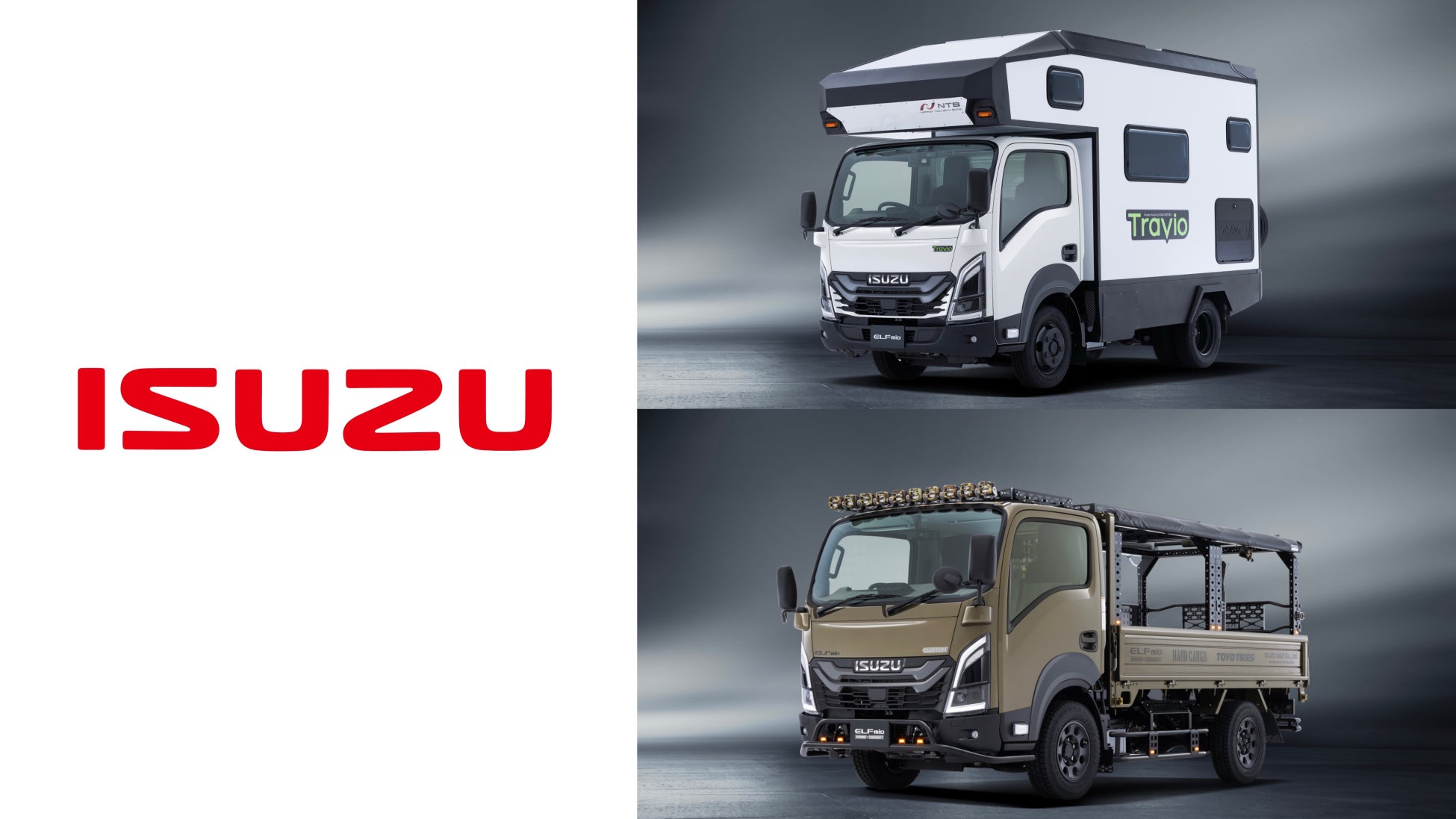 話題の小型トラック「エルフミオ」のコンセプト車両と、キャンピングカー専用シャシ「トラヴィオ」ベースのキャンピングカーを展示。トラックの堅牢性や経済性をそのままに、仕事も遊びも、エルフミオでもっと自由に。