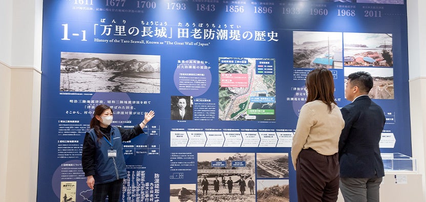 東日本大震災で大きな被害を受けた宮古市では、震災後早い段階から地元の震災体験者が有志を集め、津波の記憶伝承と防災教育のためにボランティアガイドを開始し、2012年度からは宮古観光文化交流協会の事業として、「学ぶ防災ガイド」を開始しました。ガイド内容は、津波遺構「たろう観光ホテル」の内部や、100年余り津波と戦ってきた宮古の歴史を伝える「田老防潮堤」などを案内します。そして、被害の大きかった田老地区の状況を通して、震災の恐ろしさや命の大切さ、避難の重要性を伝えています。