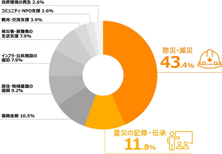 被災自治体が設定している「震災・防災」関連の寄付金の使い道をみると、「防災・減災」(未来の災害による被害を減らす取り組み)が最も多く、次いで「震災の記録・伝承」(震災遺構の保存や教訓の発信など)が多いことがわかりました。この2つのカテゴリが全体の過半数を占めています。