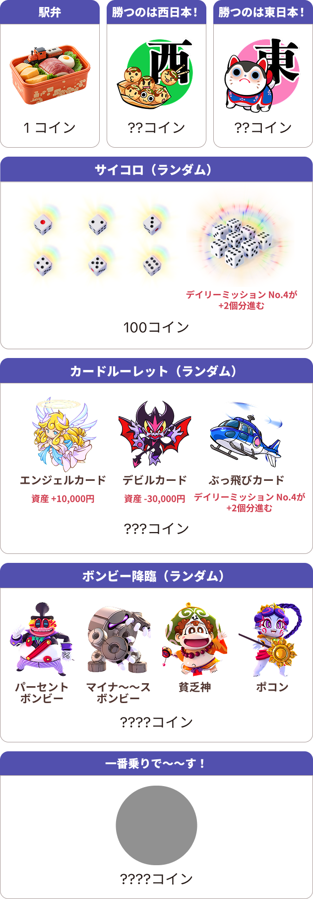 ランダムギフトでは『桃鉄2』のゲストボンビーである「マイナ~~スボンビー」 「パーセントボンビー」も登場!ゲーム中に登場するカードルーレットを模したランダムギフトでは、一部のアニメーションが出現するとポイントがマイナスになる遊び方にもぜひご注目ください。