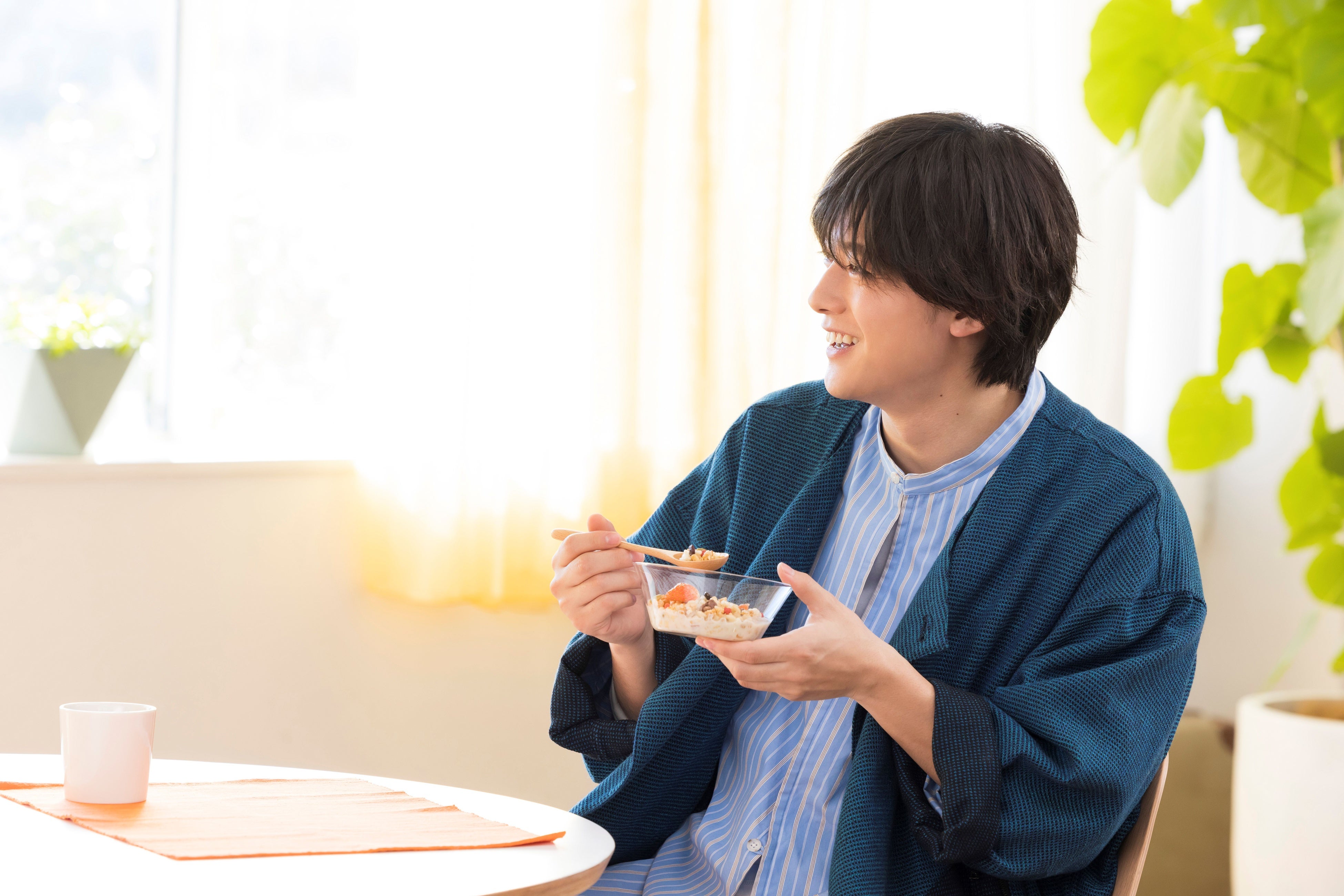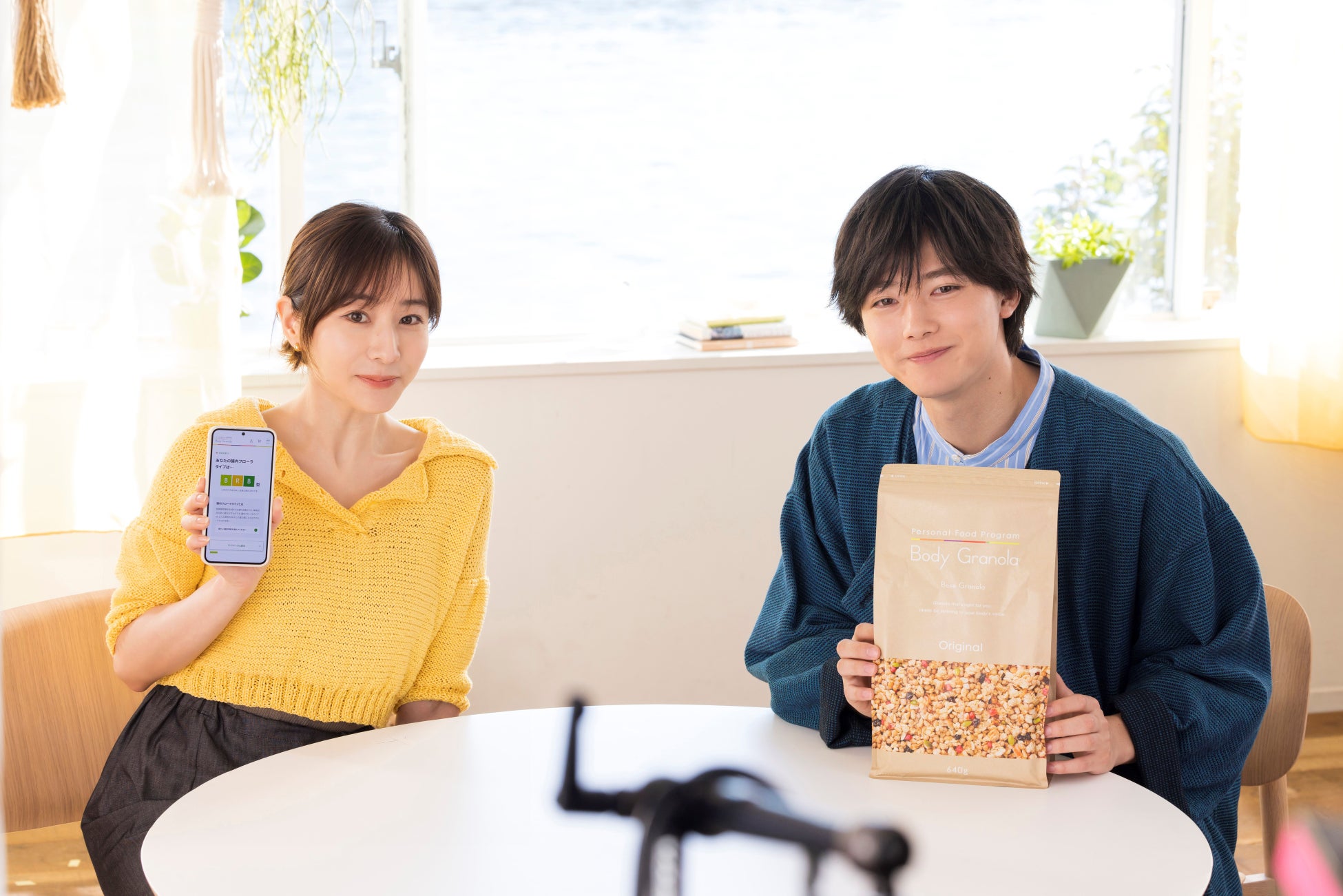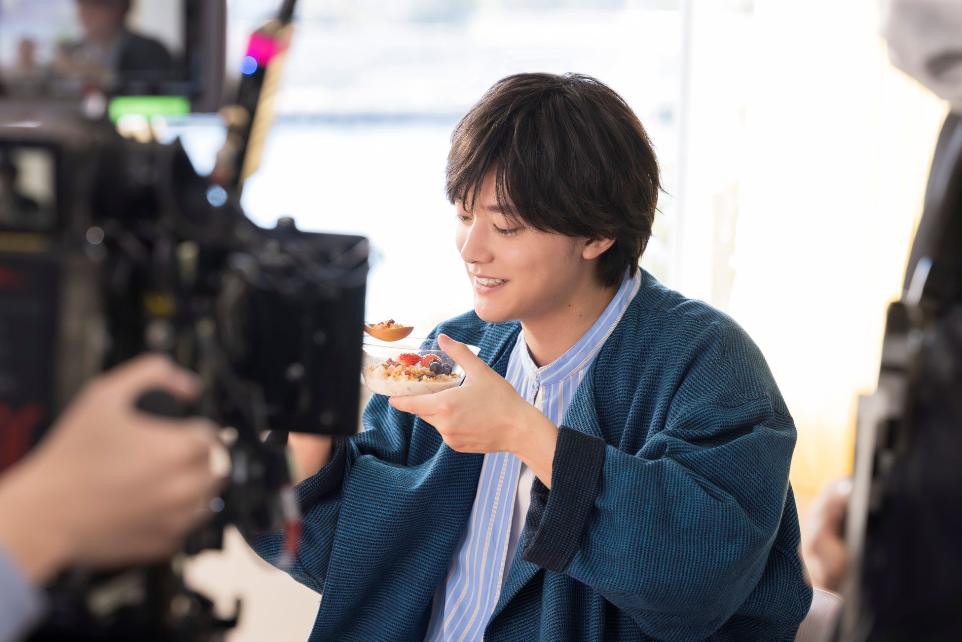 水色のストライプシャツに深い青色のジャケット、水色のフーディーでリラックススタイルだった櫻井さん。自分だけのソロのシーンでは、監督とも『Body Granola』の持ち方を試行錯誤しながら念入りに確認し撮影へ。「いい表情!食べるのが上手!」と監督からOKが出てホッとする表情を浮かべていた櫻井さん。ただ『Body Granola』の味をよほど気に入られたのか、『Body Granola』を味わうシーンでは再び口いっぱいに頬張ってしまい、しばらく話せなくなってしまう一幕も。監督から「だから食べすぎないで!(笑)」と突っ込まれ、現場は和やかな空気となりました。