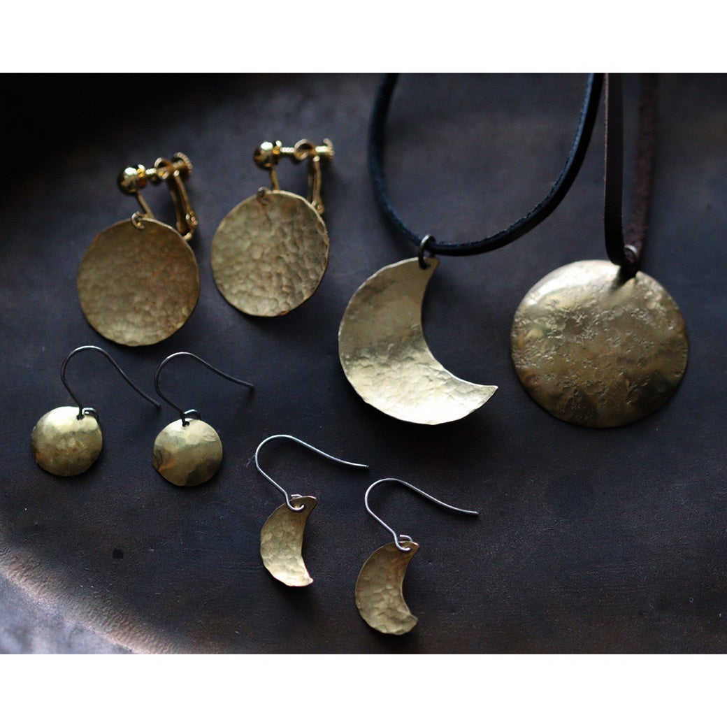 用意している満月や三日月の真鍮パーツに槌目をつけピアスまたはイヤリングまたはネックレスに仕立てます。