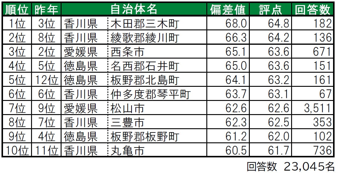 1位は木田郡三木町(昨年3位)、2位は綾歌郡綾川町(昨年8位)で、トップ2は香川県の郡部に属する「町」です。3位は愛媛県西条市です。トップ10のうち6自治体が、香川県・徳島県の各郡部に属する「町」となっています。
