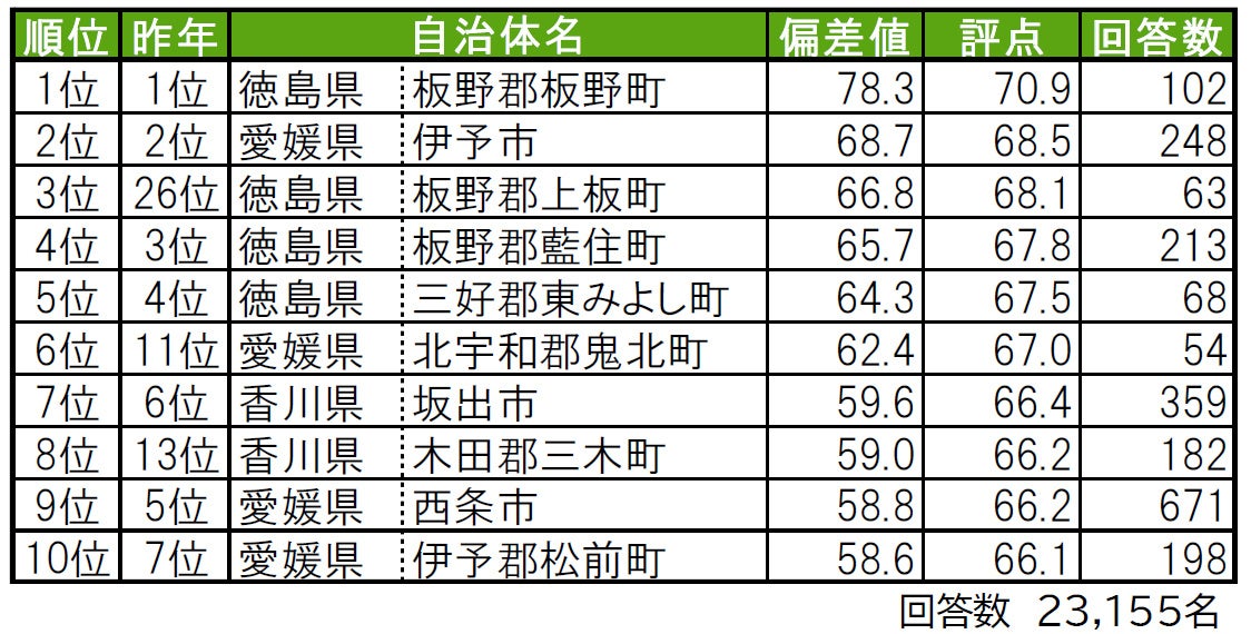 ●順位を上げてトップ10入りした自治体は、3位徳島県板野郡上板町(昨年26位)、6位愛媛県北宇和郡鬼北町(昨年11位)、8位香川県木田郡三木町(昨年13位)です。