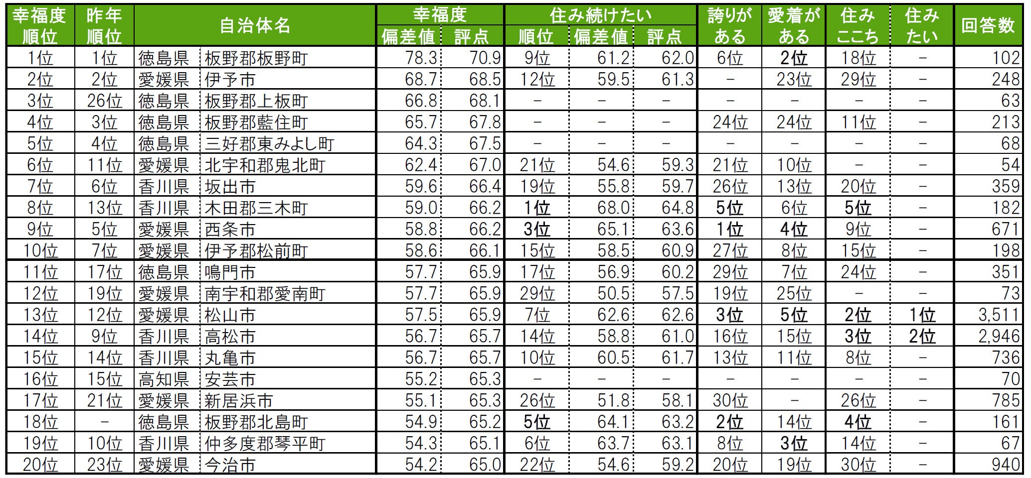 街の幸福度は3年連続で、1位徳島県板野郡板野町、2位愛媛県伊予市。3位徳島県板野郡上板町。