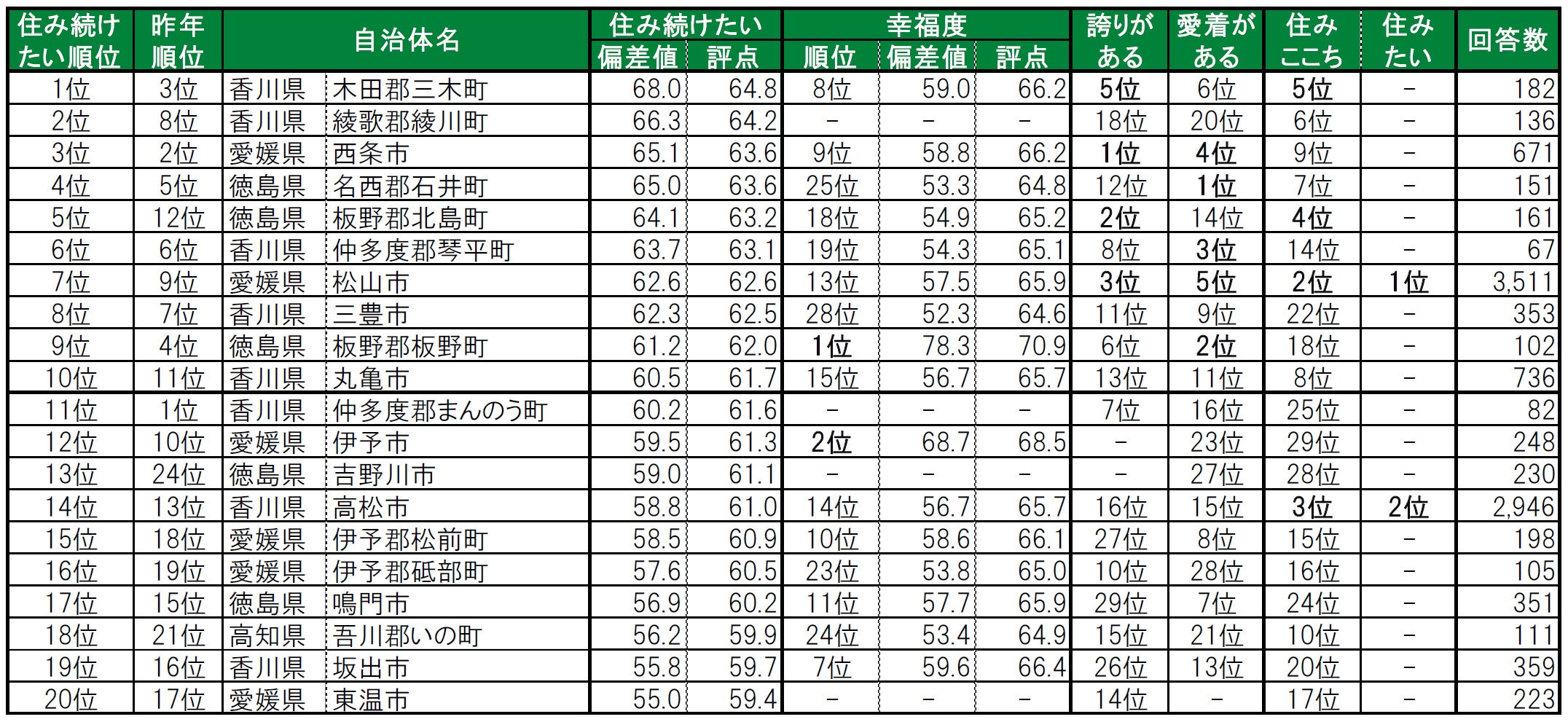 住み続けたい街は、1位香川県木田郡三木町、2位香川県綾歌郡綾川町、3位愛媛県西条市。