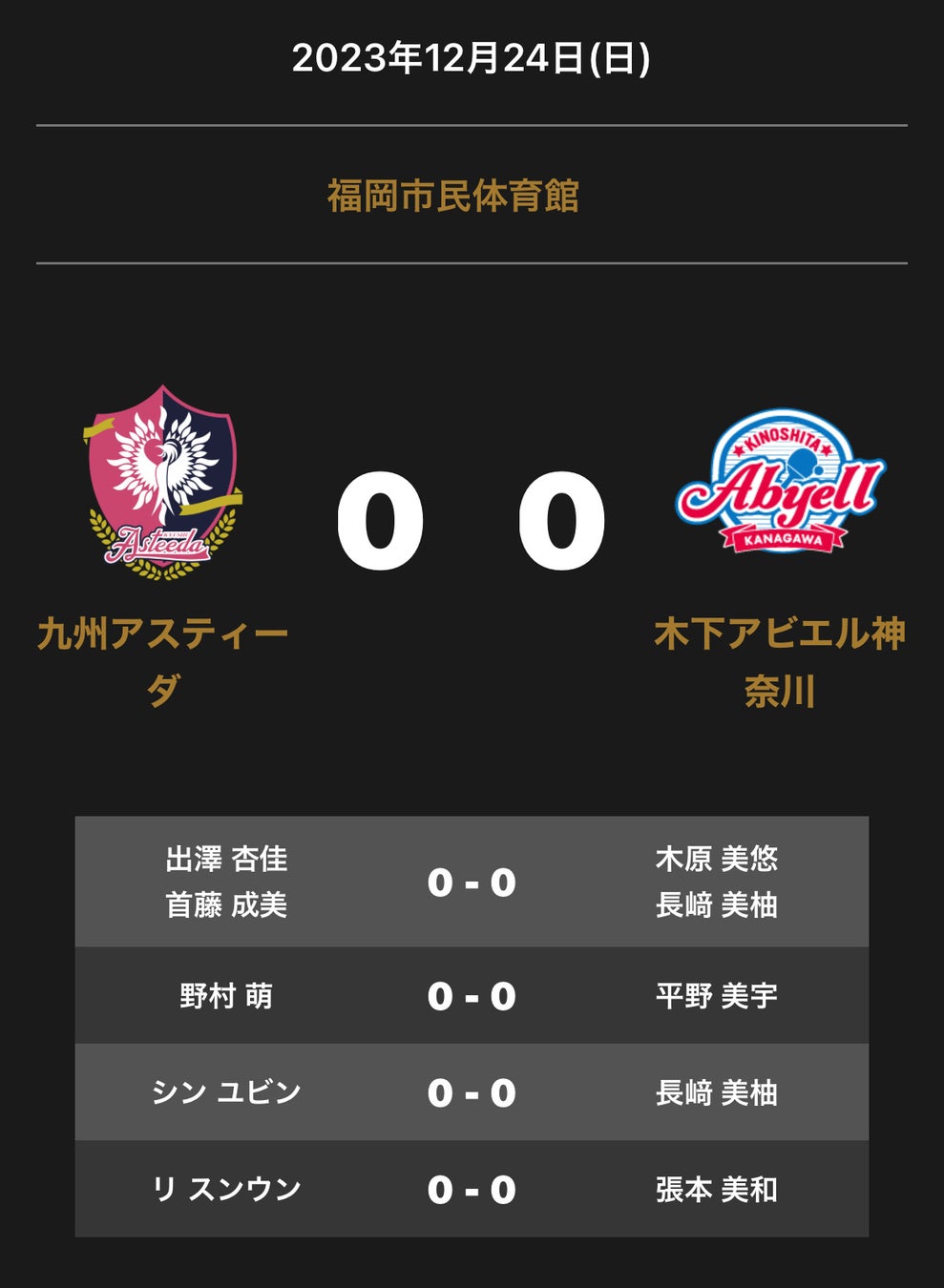 ノジマTリーグ 2023-2024シーズン 公式戦 12月24日開催 九州アスティーダ vs 木下アビエル神奈川 対戦オーダー発表