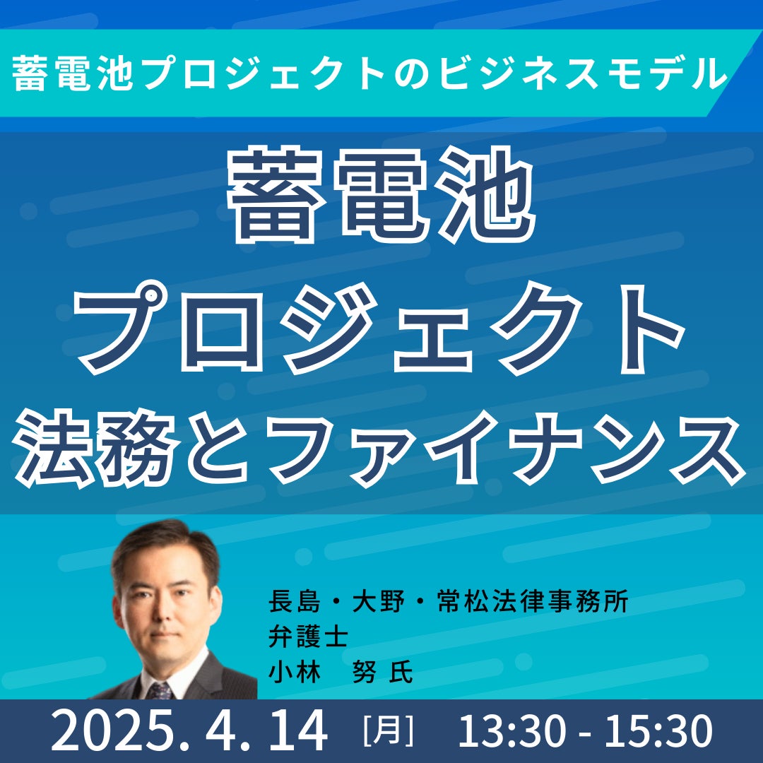 JPI(日本計画研究所)は、長島・大野・常松法律事務所 弁護士 小林 努 氏を招聘し、蓄電池プロジェクトに関する法務とファイナンスについて詳説いただくセミナーを開催します。