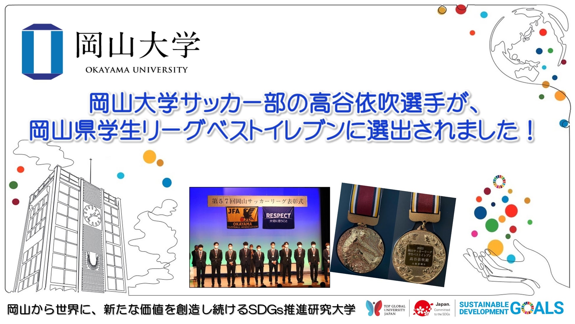 2023年2月12日に、山陽新聞社さん太ホール(岡山市北区柳町)で、岡山サッカーリーグの2022年度表彰式が行われ、岡山大学サッカー部の高谷依吹さん(工学部2年)が「岡山県学生リーグベストイレブン」に選出されました。