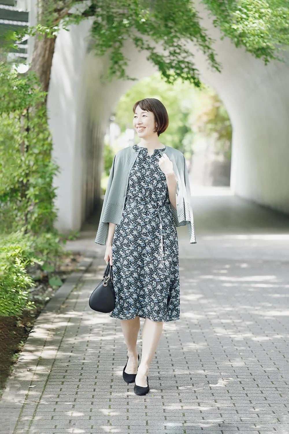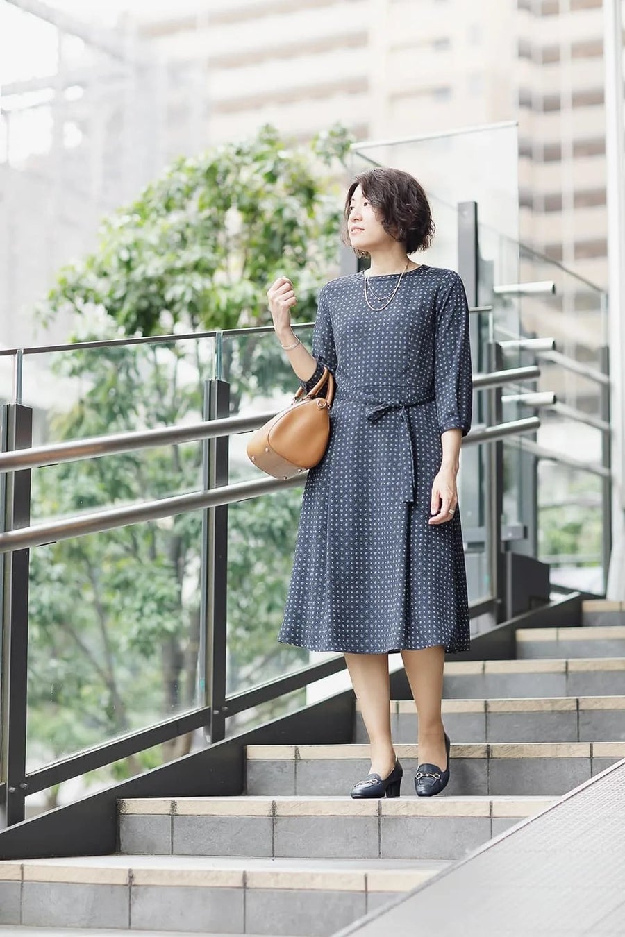 身に着けるアイテム数が少なるこの季節は、シンプルなアイテムではなんだか地味に見えがち。落ち着きのある小ぶりの柄使いを選べば、全面プリントでも品の良い印象になります。ワンピースは着崩れにくく、お腹まわりが目立ちにくいのも嬉しいポイント。