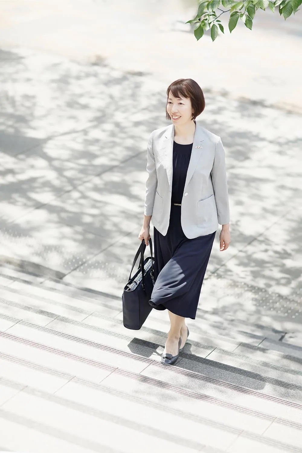 ブラウス見えの機能性カットソーは、汗ばむこの季節に重宝する一着。今シーズンは同素材で、ウエスト総ゴムのスカートもご用意いたしました。ジャケットにはライトグレーを選んで、顔回り明るく好印象に。小さめのブローチやベルトなど、アクセサリーをプラスすれば、社内行事でも活躍するプチ華やかなスタイルの完成です。