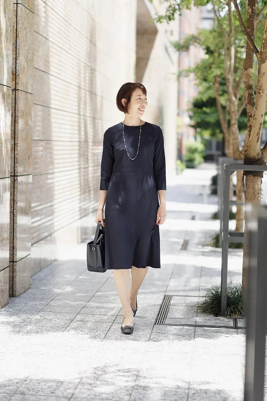 一見無地のように見えるこちらのワンピースは、表面に凹凸のある千鳥ジャカード生地。シックな印象ながら、程よい華やかもある絶妙な柄感が魅力。ウエスト切り替えにより、自然で美しいシルエットのため、ロングパールを合わせるだけで、コーデが成立します。バッグは、持ちやすいワンハンドルタイプをチョイス。小物も潔くネイビーで統一すると、より洗練されたスタイルに。