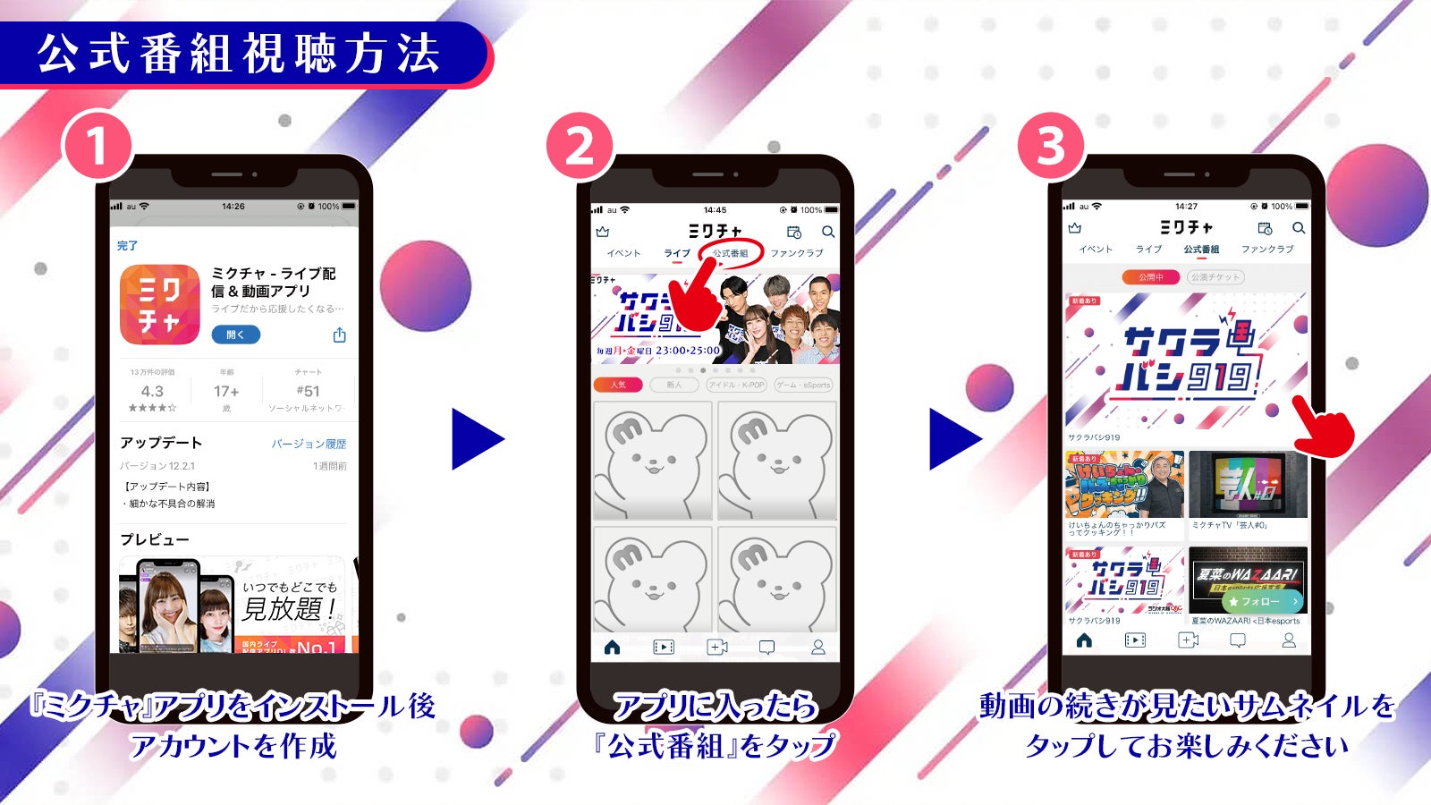 「ミクチャ」は、上記URLからアプリをダウンロードいただくことで、誰でも無料でご視聴でき、スタジオの様子を映像で観ながら『サクラバシ919』の生放送をお楽しみいただけます。なお、「ミクチャ」内にある番組アカウントをフォローすると、放送開始に合わせて通知が届くため見逃しを防げます。