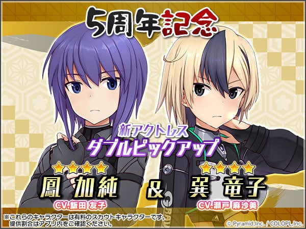 最高レアの★4キャラクター1人を確定入手できる無料スカウトや、島田フミカネ氏デザインの5周年記念コスチュームが1着無料でもらえるキャンペーン、新プレイアブルキャラクター「鳳 加純(CV:飯田 友子)」と「巽 竜子(CV:瀬戸 麻沙美)」の追加など、ゲーム内にて様々なキャンペーンやアップデートを実施しております。