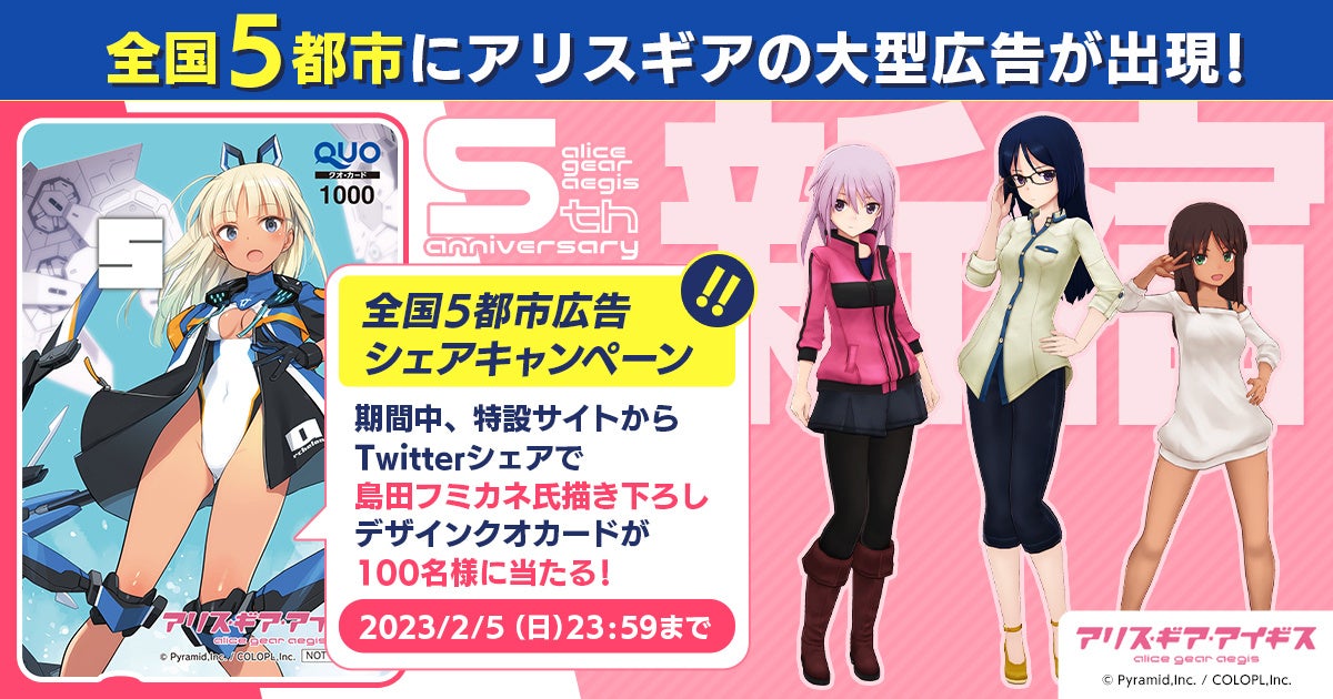 株式会社コロプラ(代表取締役社長:宮本貴志、本社:東京都港区、以下「コロプラ」)は、スマートフォン向けゲーム『アリス・ギア・アイギス(以下、アリスギア)』が2023年1月22日(日)で5周年を迎えたことをお知らせいたします。