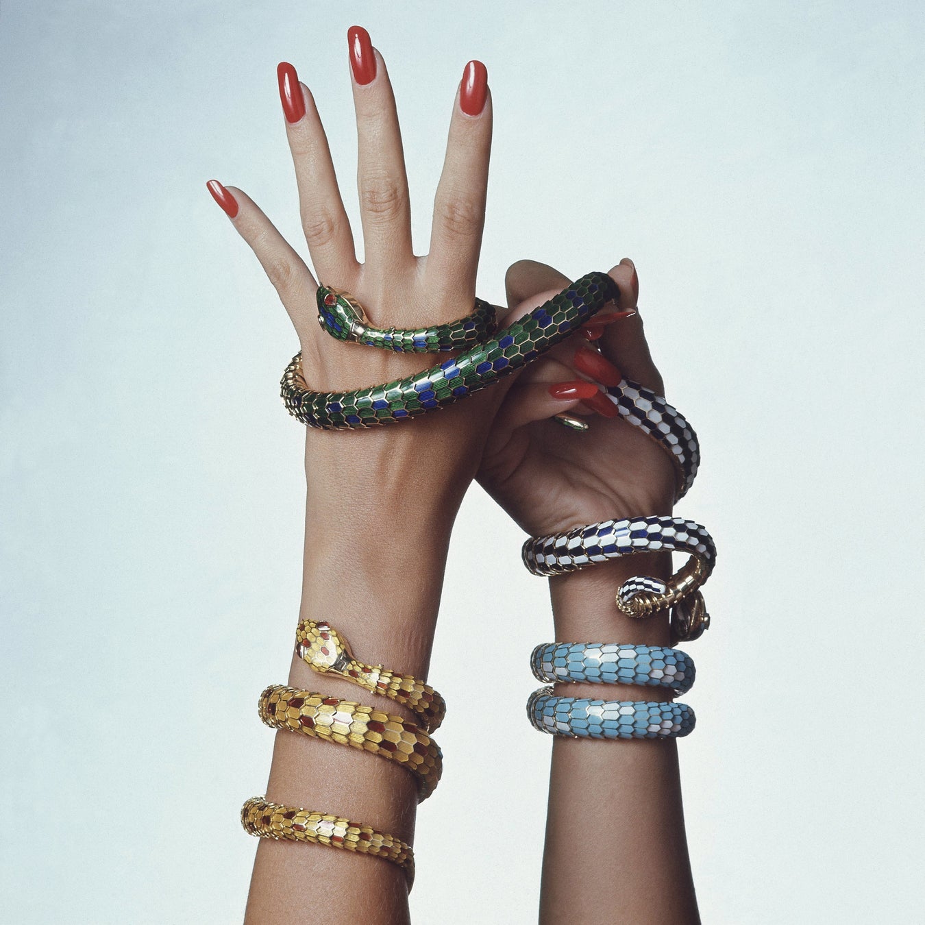 「腕に巻きつくトゥボガスのブレスレット蛇の頭にセットされたウォッチのコンビネーションは非常に斬新なものでした。これによりブルガリは蛇をモチーフとしたウォッチをアイデンティティの中心に据えた初のブランドとなりました」