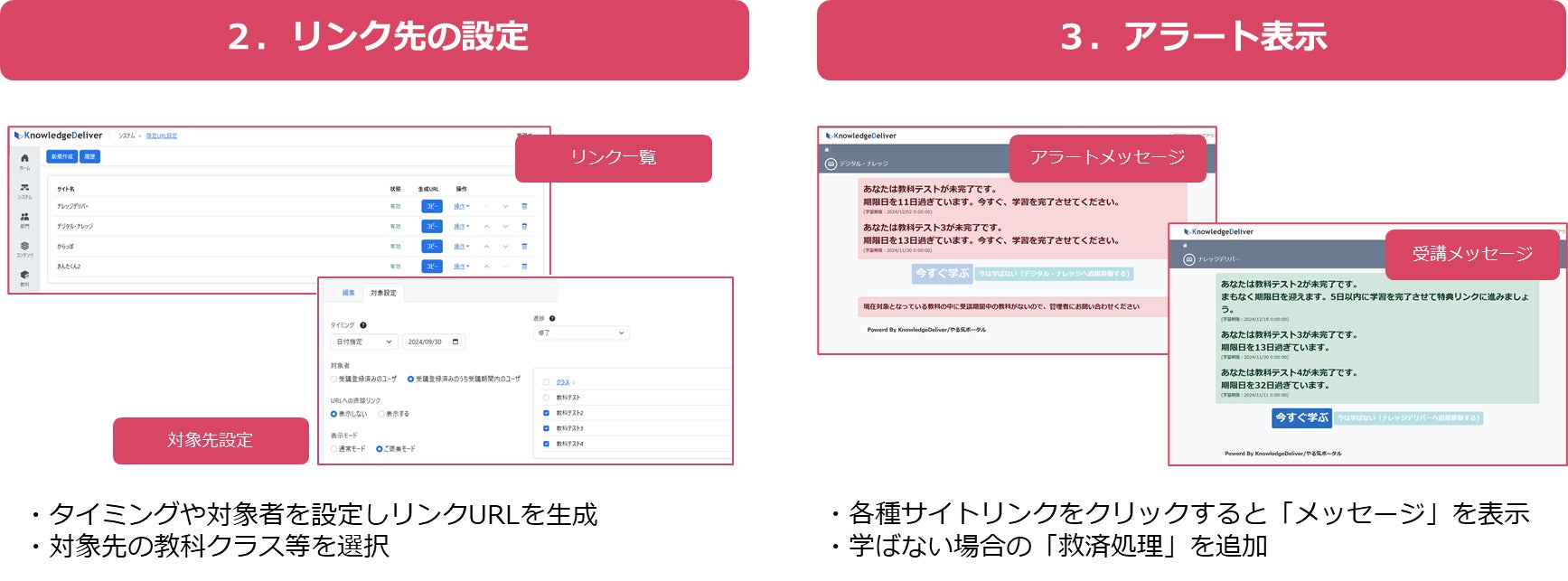 「学びポータル」は、eラーニングの受講が未完了の場合、他のツールの利用時に注意喚起を行ったり、自動でeラーニングの受講画面に遷移させたり、ツールの利用に制限をかけたりすることができる仕組みです。これにより、生徒や受講者が、学習のタイミングを逃さず、スムーズに受講へ進めるよう支援します。