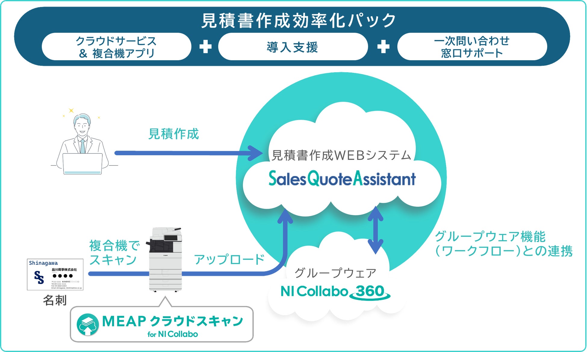 “見積書作成効率化パック”は、見積書作成WEBシステム「Sales Quote Assistant※2」にて、クラウド上で見積書の作成から承認、発行までを一貫して行える機能を提供します。また、複合機のスキャン機能を利用した名刺からの顧客情報登録も可能で、手入力による作業負荷を軽減します。営業担当者は見積書の作成・承認・発行を一元管理でき、全社での共有が可能になります。これにより、営業活動の効率化や顧客対応スピードの向上を実現します。見積書フォーマットや計算式は自由に設計できるため、お客さまごとにテンプレートを設定し、最適な形式で効率よく見積書を作成できます。導入支援と保守サービスも合わせて提供し、スムーズな導入と運用をサポートします。