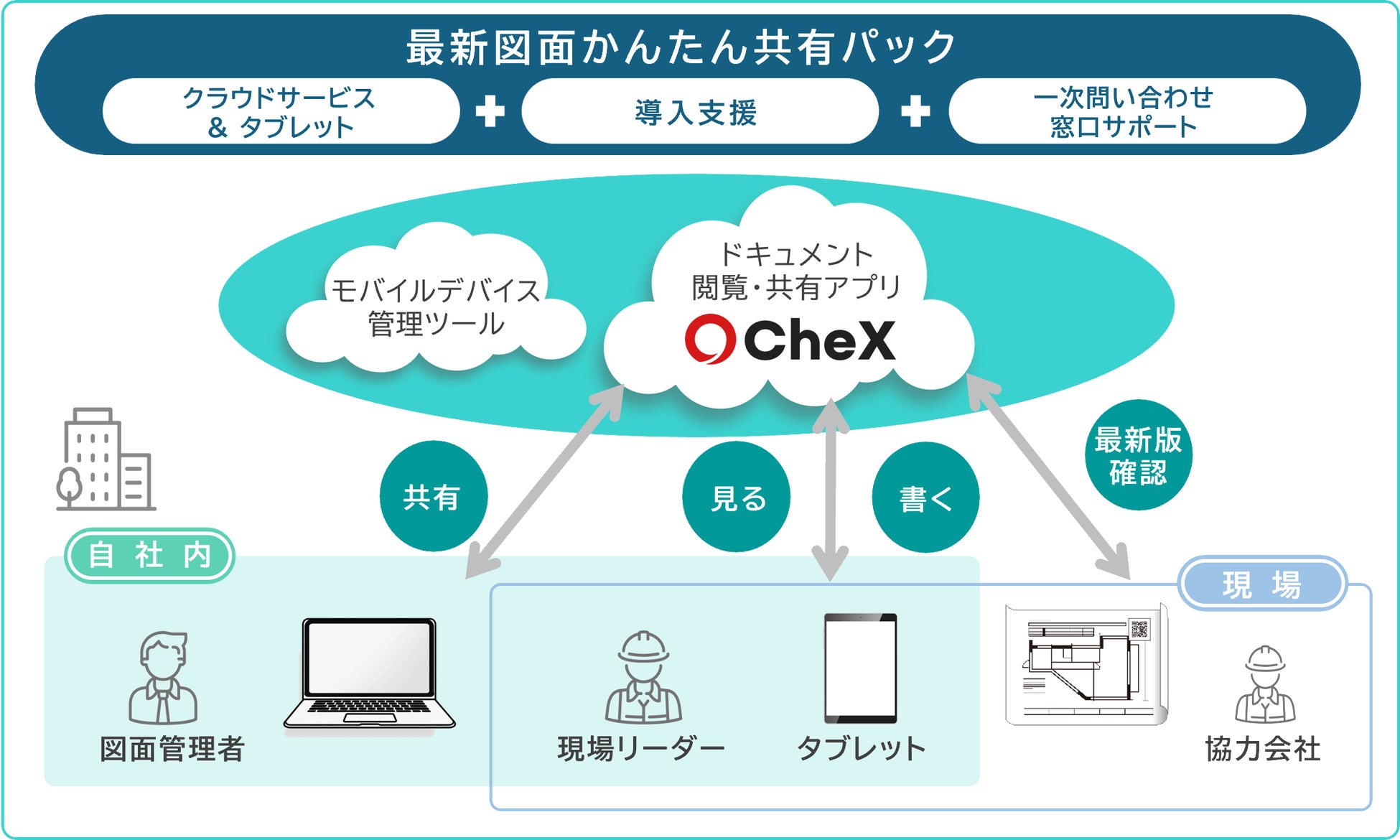 “最新図面かんたん共有パック”は、ドキュメント閲覧・共有アプリ「CheX(チェクロス)※4」にて、図面をクラウド上で一元管理できるサービスを、タブレットやモバイルデバイス管理ツールと合わせて提供します。これにより、現場リーダーは最新の図面をクラウド上にアップするだけで、現場関係者全員へ共有することが可能になります。また作業者は紙の図面に記載したQRコードを読み取ることで、最新図面かどうかを確認できるため、現場リーダーへの版確認の問い合わせを削減し、古い版のまま作業工程が進むトラブルを防止できます。さらに現場ではタブレットから図面への書き込みが可能で、現場で集めた情報を迅速に他の作業者や現場リーダーと共有できます。本パックでは、導入支援から保守サービスまでワンストップで提供し、スムーズな活用をサポートします。さらに、建設業のお客さま向けには、建設現場での図面の活用方法に応じた導入支援を行う“建設業向け 最新図面かんたん共有パック”を提供します。
