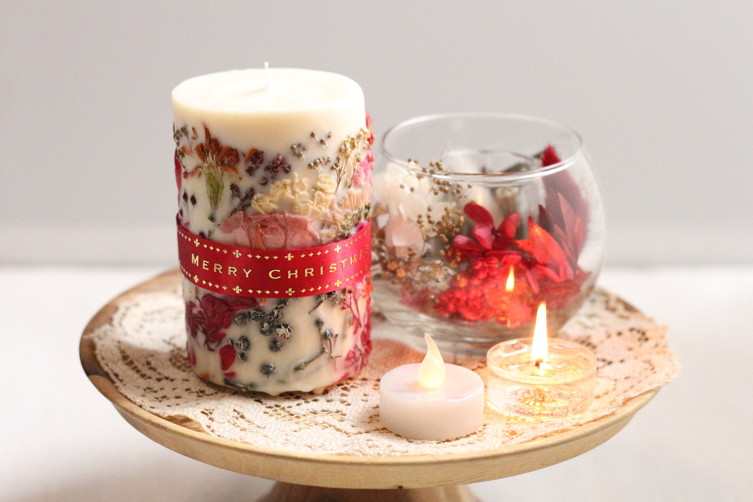 生花をたっぷり使い、まるで刺繍のような見た目の繊細で美しいクリスマスキャンドルを作りましょう。