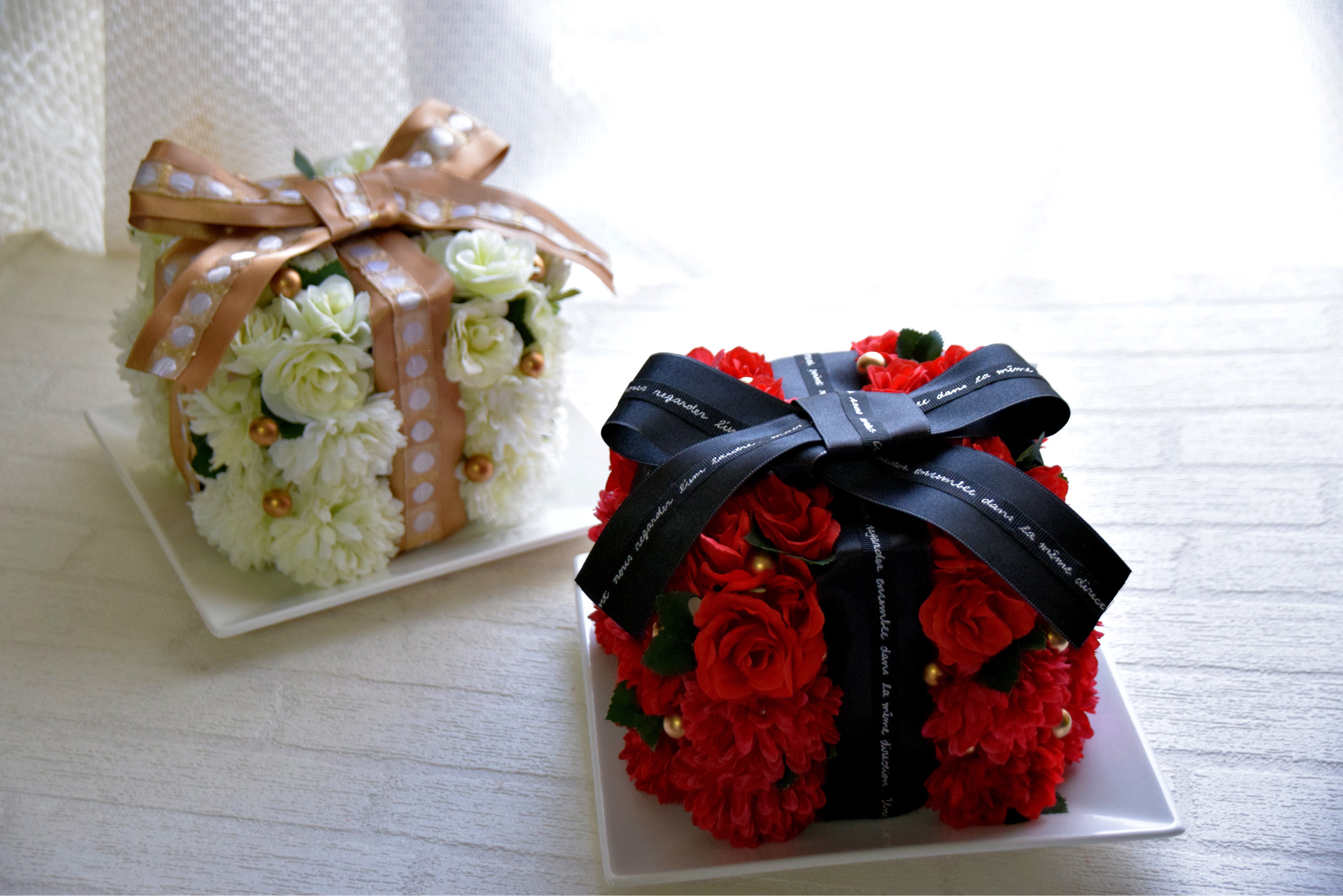 アーティフィシャルフラワーを使い、リボンを結んで、まるでプレゼントボックスのようなかわいいキューブ型アレンジを作ります。花の色は、レッドとホワイトの2色からお選びいただけます。クリスマスのディスプレーやギフトにもおすすめのアレンジです。