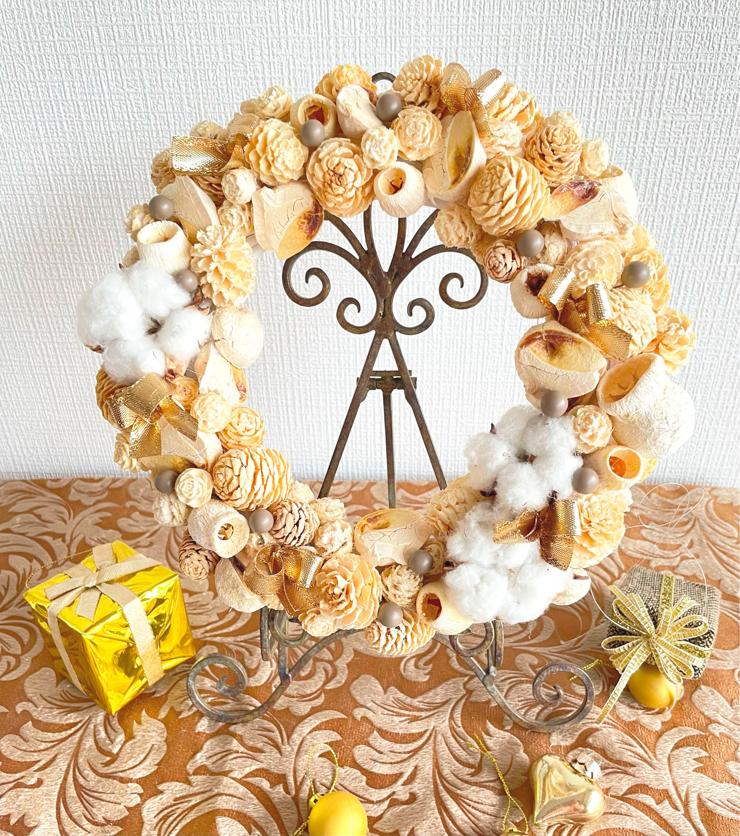 ドライの実をメインとして、一年中飾っていただけるリースを作ります。クリスマス定番のホワイトリースを