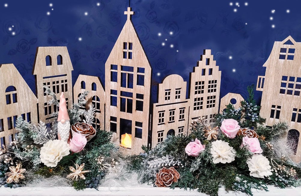 木製のデコスタンドにプリザーブドフラワーをアレンジしてクリスマスの街をお部屋に飾りましょう!LEDのキャンドルを灯せば まるで聖夜そのもの。横45cmで見栄えがする作品です。花の色はシャーベットピンクと