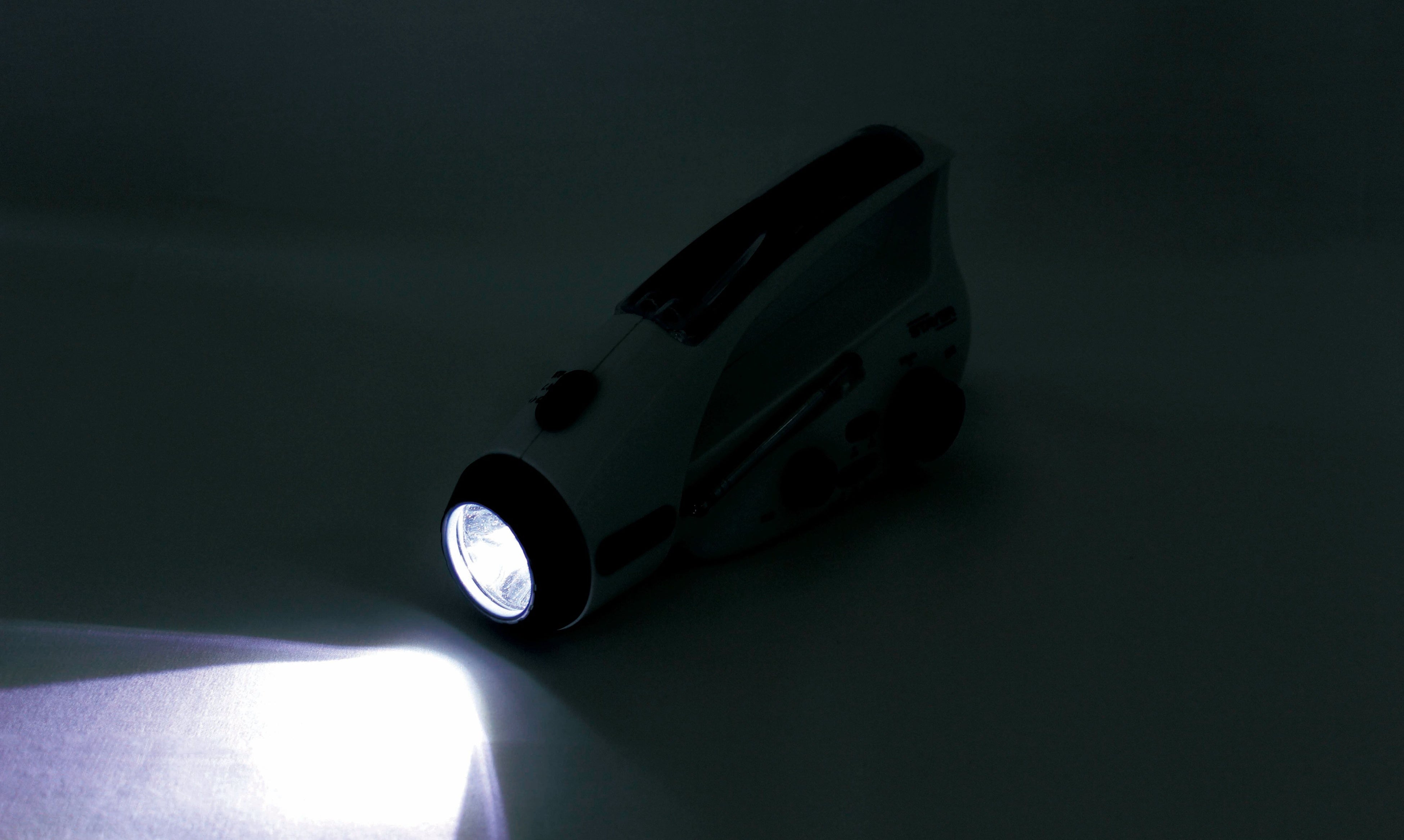 USB・ソーラー・手回しの3つの方法で充電ができる軽量タイプのラジオライト。LEDライトやサイレンも搭載。内臓電池2000mAh。