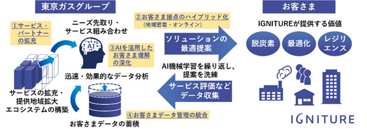 IGNITUREは、東京ガスが安心・安全・信頼のコーポレートバリューによってこれまで築いてきた顧客基盤やエネルギーマネジメントのノウハウと、GX(グリーントランスフォーメーション)やDX等の先進的技術を融合させ、新たなソリューションを提供する事業ブランドです。サービスの拡充と提供の仕組み構築を進め、より充実したソリューションを提供するべく、①サービス・パートナーの拡充、②お客さま接点のハイブリッド化、③AIを活用したお客さま理解の深化、④お客さまデータ管理の統合を推進しています。