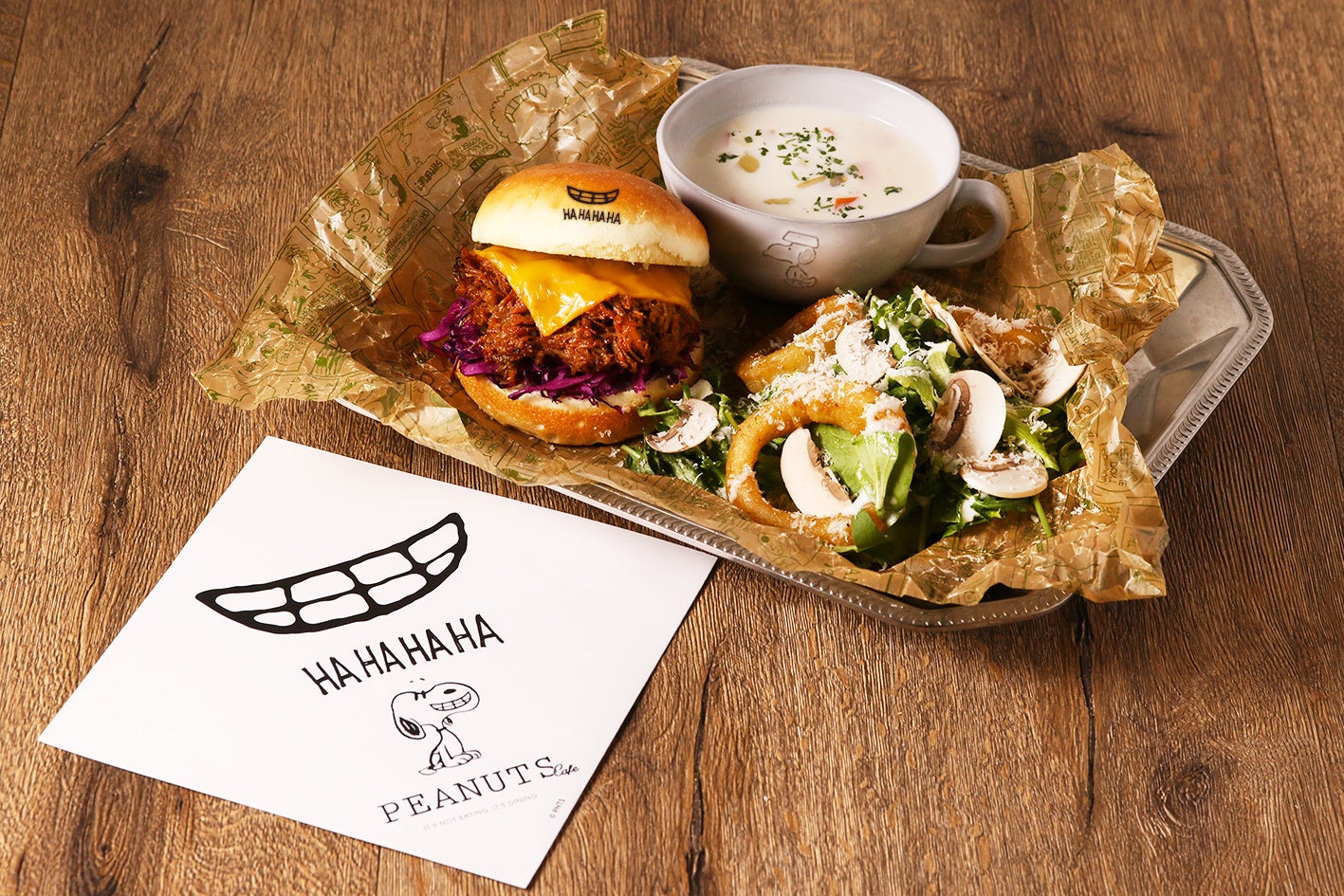 2022年1月15日(土)から開催するスヌーピーミュージアムの新企画展『Laugh and Smile~しあわせは、みんなの笑顔~』に連動して、「ピーナッツ」のコミックの笑いやほほ笑みのエピソードから笑いをイメージしたハンバーガーやデザートを販売します。
