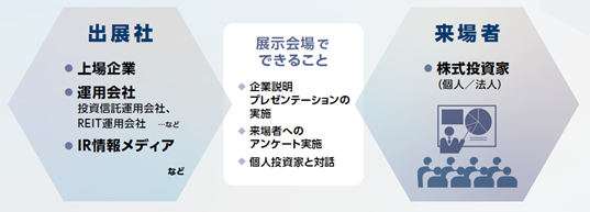 IR・株式投資フェアは、日本最大級の投資商品の総合展、資産運用EXPO内で開催する、株式投資家と上場企業・運用会社の相互コミュニケーションのためのイベントです。出展社は、ブース内でのミニプレゼンや、相談席での個人投資家との対話、特設会場でのセミナー講演の実施などが行えます。