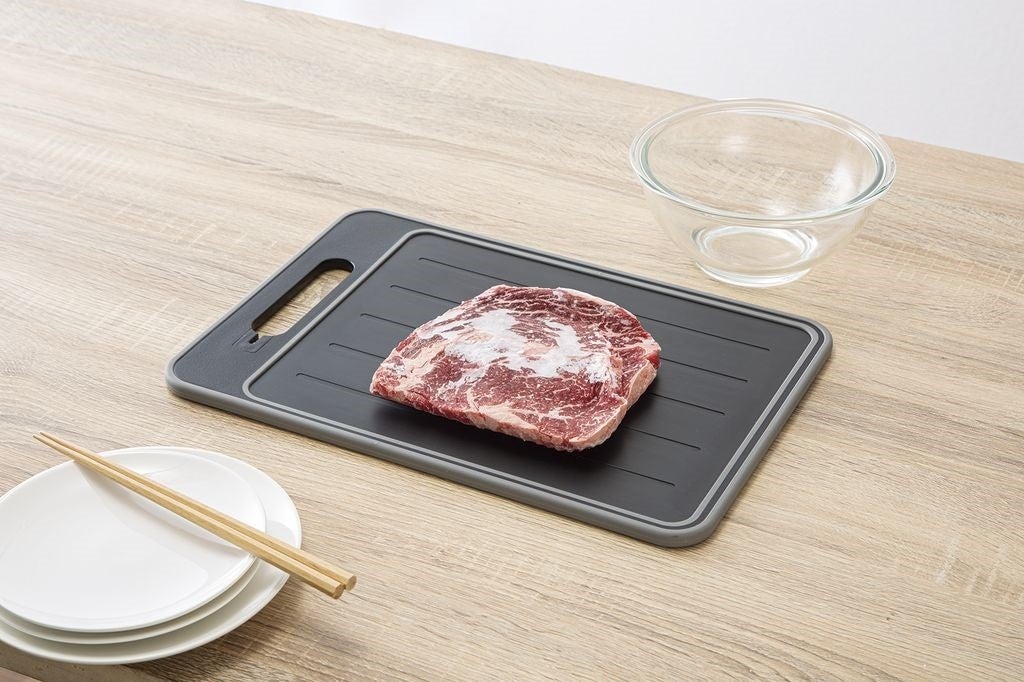 熱伝導率の高いアルミニウム製プレートを採用し、冷凍食材を効率よく解凍できます。さらに、包丁のお手入れができるシャープナー付きで、切れ味をキープしていただけます。薬味作りに便利なおろし部も備え、余分な洗い物も増えません。加えて、カットは解凍面の反対側で行うため衛生的です。4つの機能を1枚に集約したことで、収納もラクラク。毎日の料理時間を短縮できる、便利なまな板です。