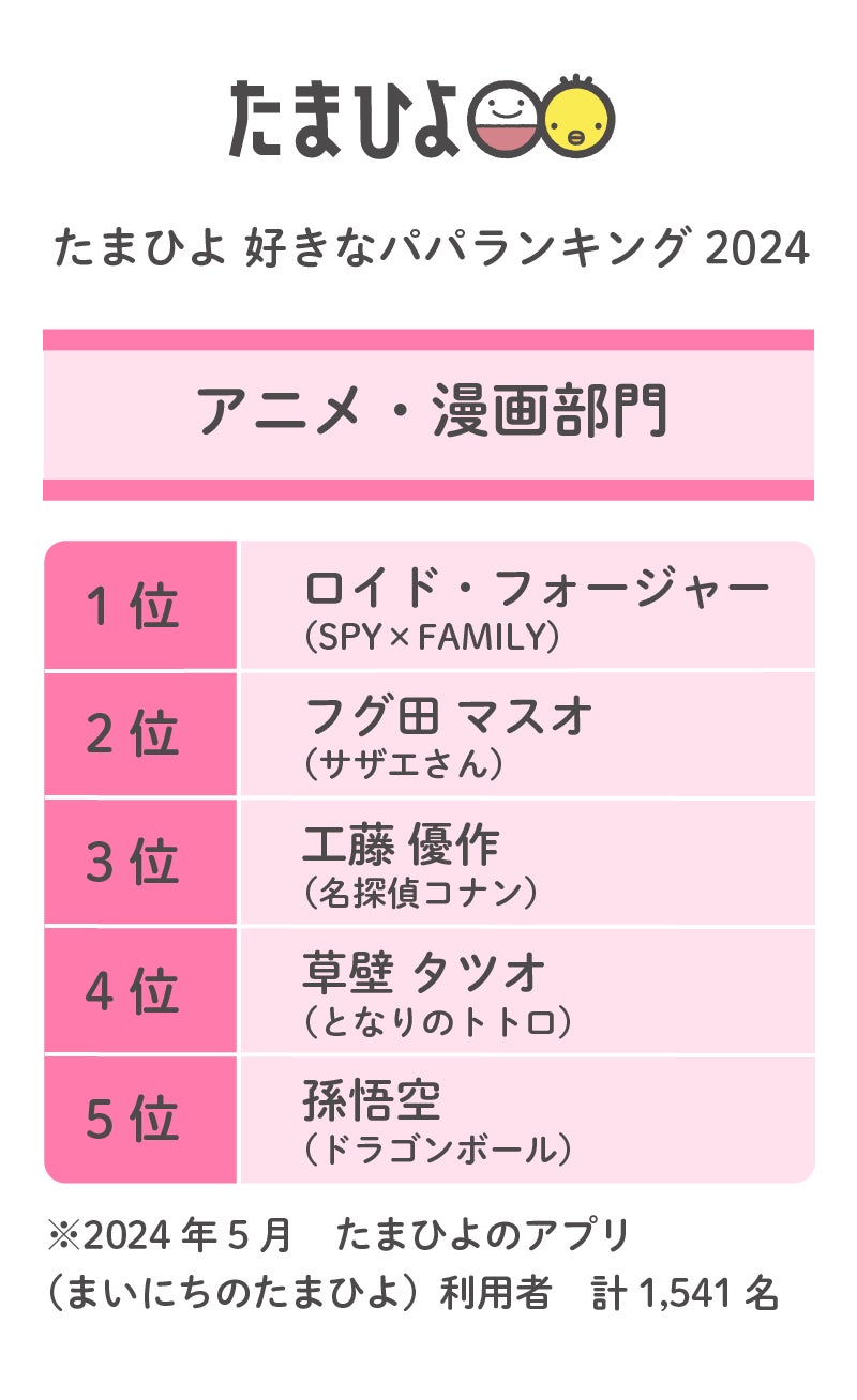 4位は『となりのトトロ』の草壁タツオさん、5位は『ドラゴンボール』の孫悟空さんがランクインしました。
