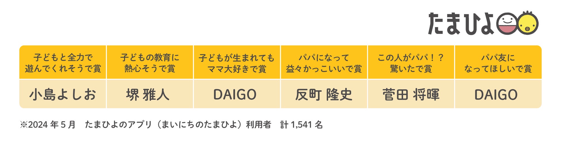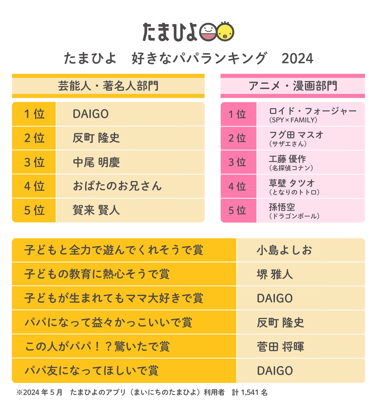 今年は、俳優・タレントのDAIGOさんが、〈芸能人・著名人部門〉1位に輝きました。妻と2人のお子様との時間を大切にされていることや、ユーモアを持って楽しんで育児に取り組まれている姿が子育て世代の支持を集めました。2位には、夫婦でのテレビCMやドラマ共演で話題を集めた反町隆史さんが初ランクイン。また、「子どもと全力で遊んでくれそうで賞」に小島よしおさん、「子どもの教育に熱心そうで賞」に堺雅人さんがランクインするなど、6つの賞もあわせて発表します。