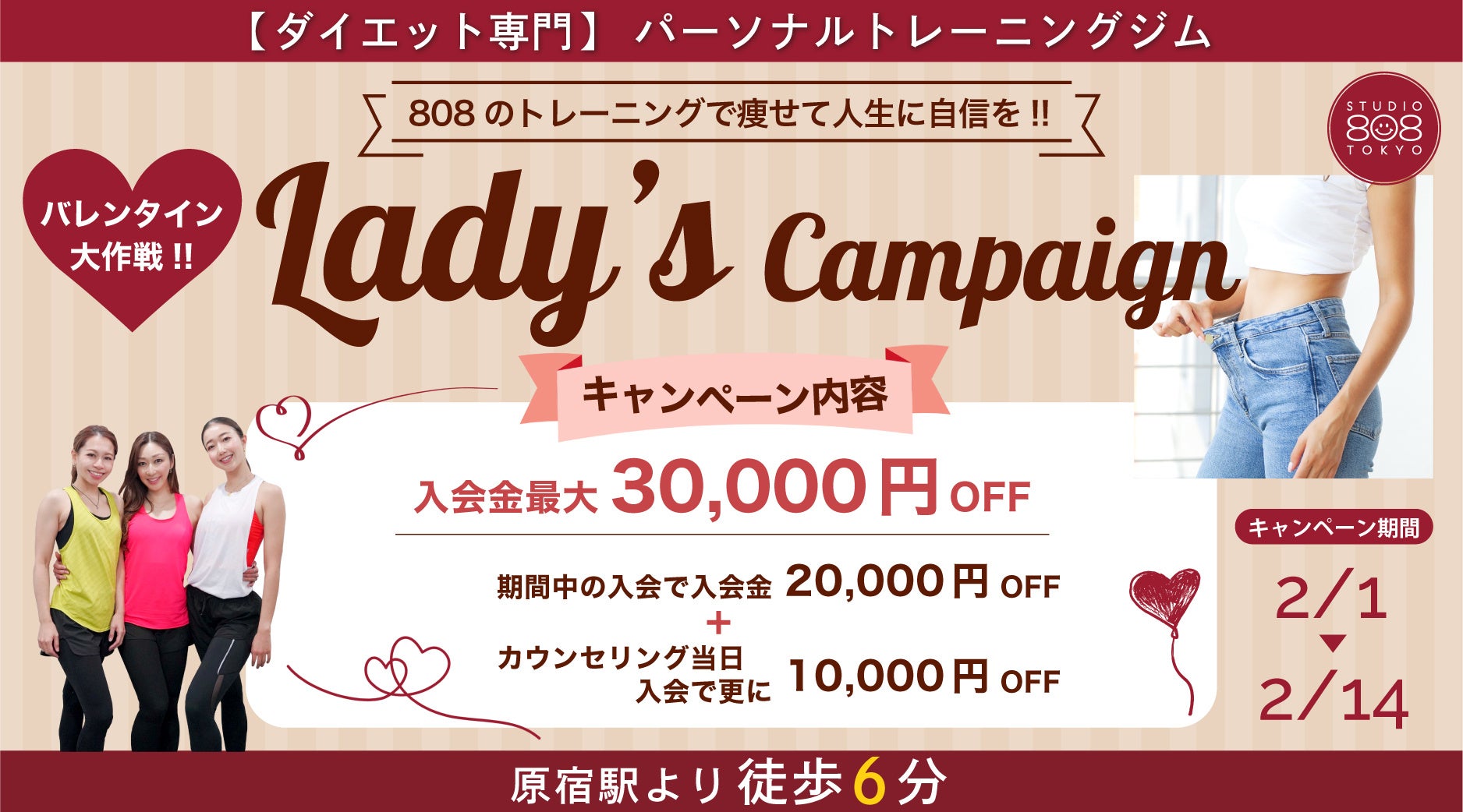 原宿駅から徒歩6分。ダイエット専門 完全プライベートパーソナルトレーニングジム808TOKYOが、頑張る女性を応援!! 入会金が最大30,000円割引となる【 バレンタイン大作戦!レディースキャンペーン 】を開始しました。