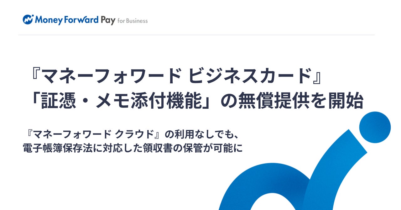 株式会社マネーフォワードは、SaaS基盤を活用したFintechサービス『マネーフォワード Pay for Business』の決済手段として提供している法人・個人事業主向けのビジネスカード『マネーフォワード ビジネスカード』において、「証憑・メモ添付機能」の無償提供を開始しました。これにより、『マネーフォワード クラウド』を利用していない場合でも、アプリやWebからカードの利用明細と紐付けた証憑の添付が可能になるため、電子帳簿保存法に則って保管することができます。