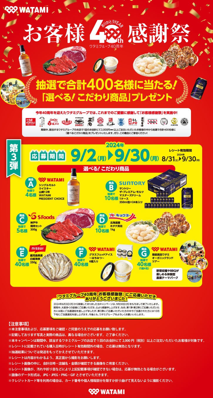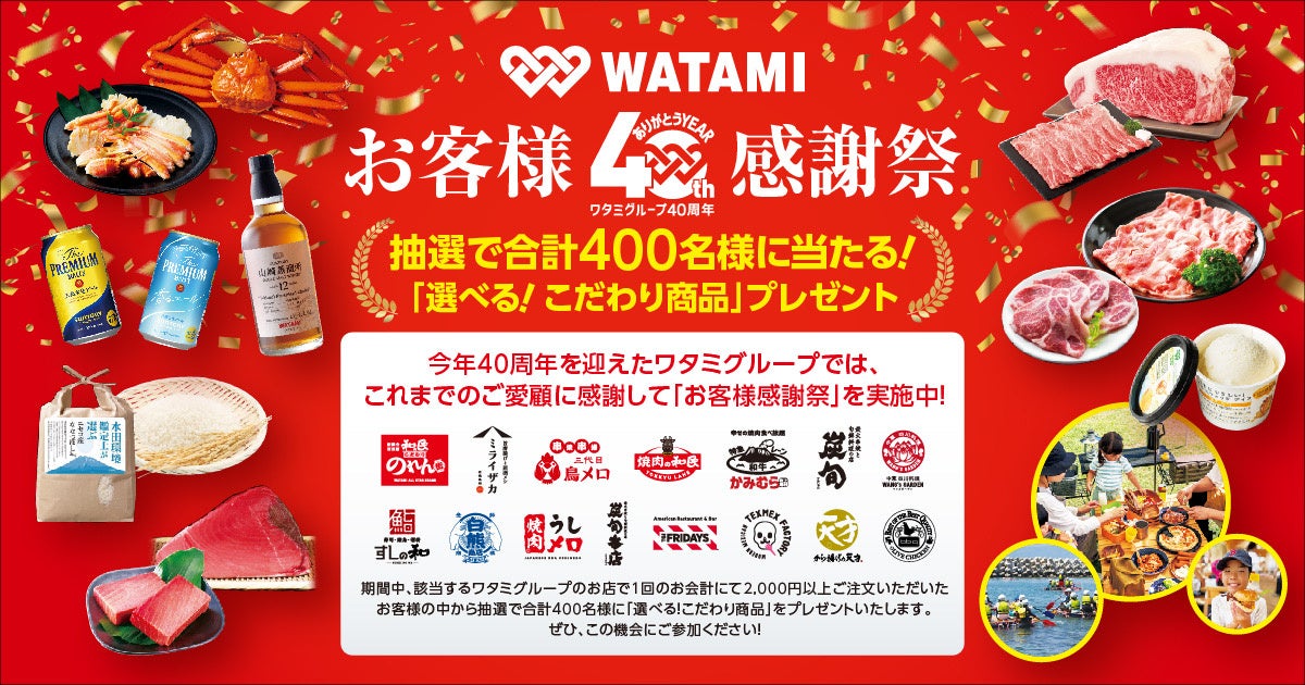 ワタミ株式会社(本社:東京都大田区、以下ワタミ)は、今年で創業40周年を迎えました。40周年を記念して、ワタミの外食店舗では、日頃よりご愛顧いただいているお客様に感謝の気持ちを込めて、「お客様40周年感謝祭」を実施しております。40周年感謝祭の第三弾は9月2日(月)~9月30日(月)(レシート有効期間8月31日(土)~9月30日(月))で開催いたします。キャンペーンは国内外食店舗で1回のお会計につき、2,000円以上(税別)ご利用いただいたお客様を対象に「選べる!こだわり商品」をプレゼントとなっております。ぜひ、この特別な機会にお食事をお楽しみいただき、豪華なプレゼントを手に入れるチャンスをお試しください。