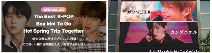 2023年2月8日(水)から2月21日(火)までの期間で開催した、「この冬、一緒に温泉旅行したい男性アイドルは?」の投票において1位に選ばれたカン・ダニエルさんの応援広告が、新大久保のK-PLAZA 1号館の屋外ビジョンで上映されます。