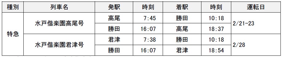 ◆「第130回水戸の梅まつり」開催にあわせて、偕楽園や弘道館へのお出かけに便利な臨時列車を運転します。早春の香り漂う梅の名所へ、週末のお出かけをお楽しみください