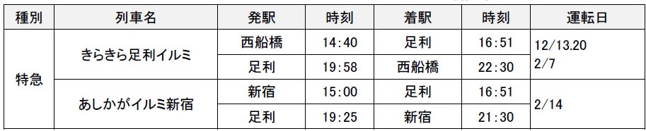 ◆「あしかがフラワーパーク」へのお出かけに便利な臨時列車を運転します。日本三大イルミネーションにも選ばれた、心躍る幻想的な世界をお楽しみください。
