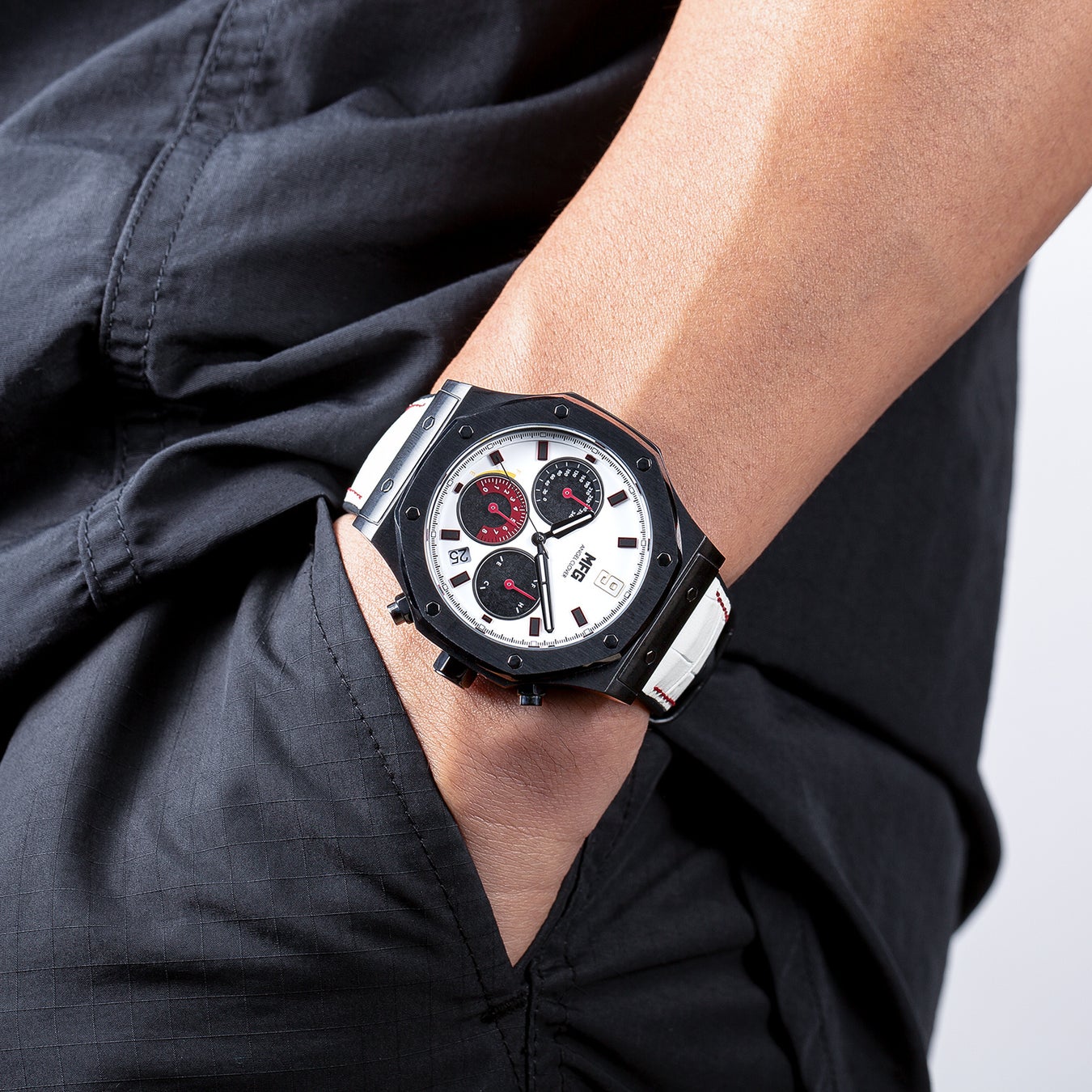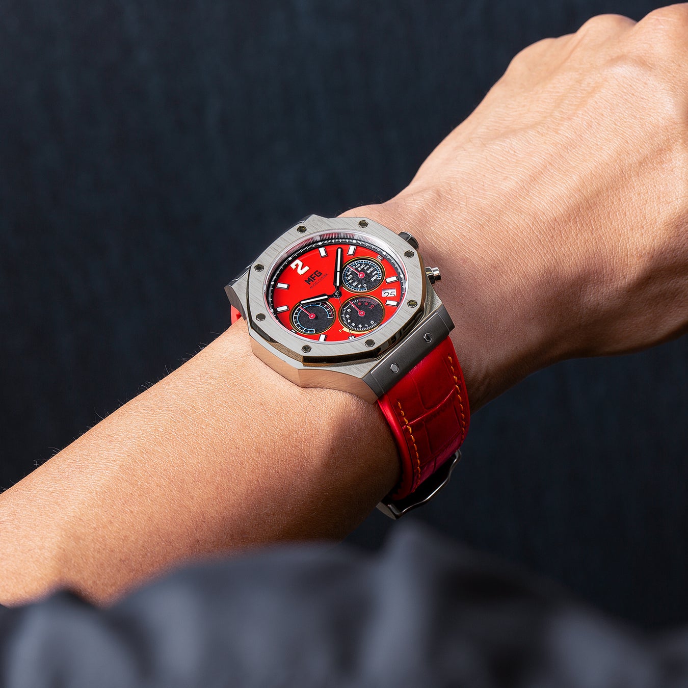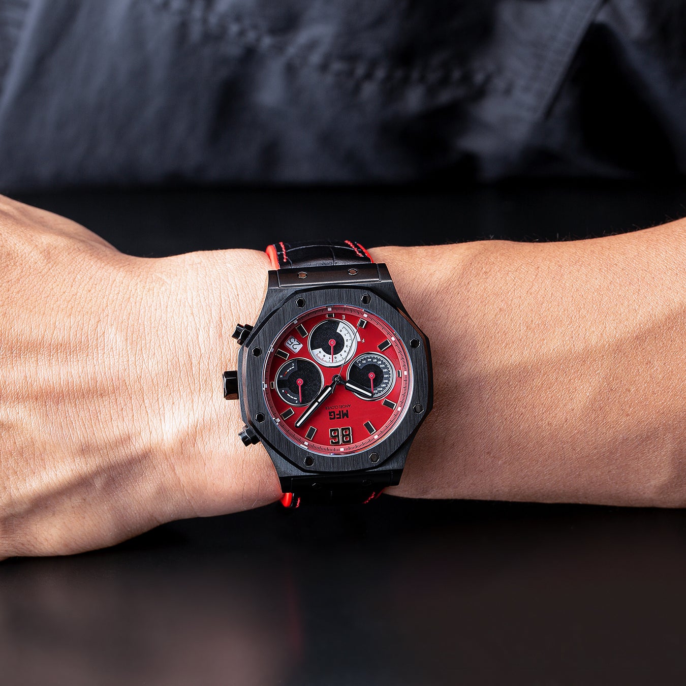 ダイヤルとケースには、愛車のカラーリングを踏襲。12時位置には劇中でお馴染みのカーナンバーと「MFG」ロゴを配置。ソーラーセルを搭載したサブダイヤルは車載メーターをイメージしています。