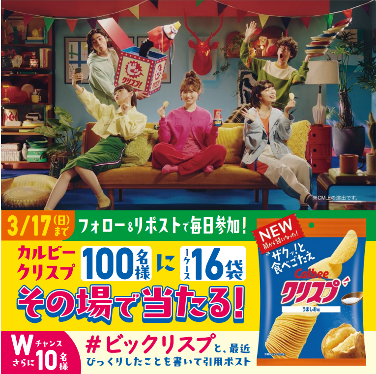 カルビーPR部公式X(旧Twitter)上で、「クリスプ」が当たるプレゼントキャンペーンを2回に分けて実施します。