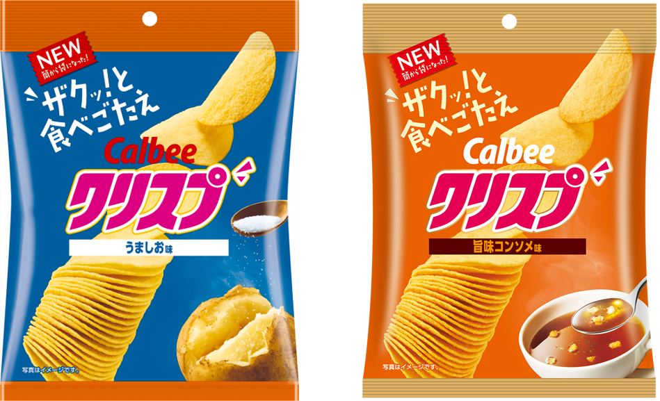 カルビー史上初!袋に入った成型ポテトチップスが誕生 筒から袋に一新!よりおいしく、手軽になった『クリスプ うましお味/旨味コンソメ味』