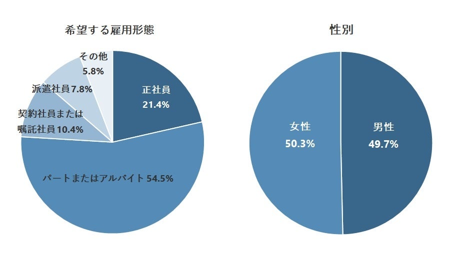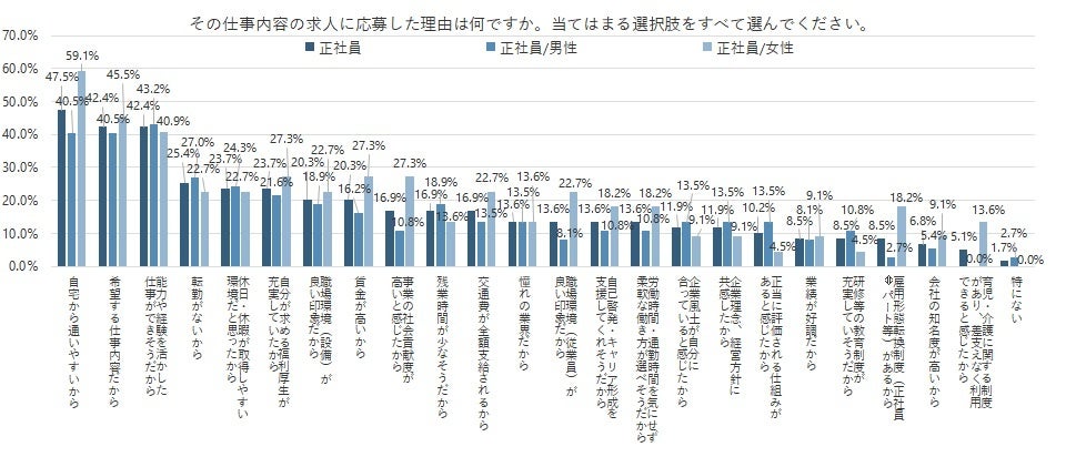 一方、「女性」のほうが「男性」よりも「自宅から通いやすいから」が18.6pt、「事業の社会貢献度が高いと感じたから」が16.5pt、「雇用形態転換制度(正社員⇔パート等)があるから」が15.5pt高くなった。このほかにも「職場環境(従業員)が良い印象だから」「育児・介護に関する制度があり、差支えなく利用できると感じたから」といった項目も男性より支持されていて、多くのこだわりを持ちながら仕事探しを進めていることが伺える。