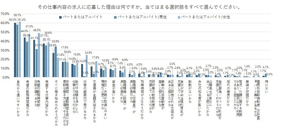 「自宅から通いやすいから」60.0%、「希望の勤務時間帯だから」44.0% 、「希望の勤務時間数・日数が選べるから」41.1%、女性は男性より「扶養の範囲内で働けるから」が23.4pt高い結果