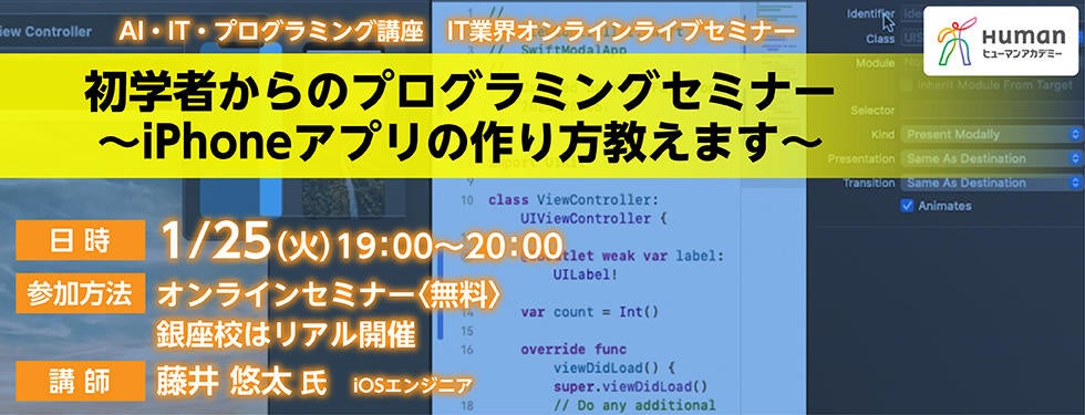 日本のほとんどの人がもはや必要不可欠となっているスマートフォンアプリ。今では一人あたり平均103個のアプリを持っているという調査結果が出ています。 そんなスマートフォンアプリの中でも最大のシェアのiPhoneアプリを作る為に何をすればいいのか、最初の一歩から学べます。 ヒューマンアカデミーのiPhoneアプリ開発講座にも登壇されている藤井 悠太先生がライブコーディングでその場でアプリの作り方を説明するスペシャルセミナーです。 |
