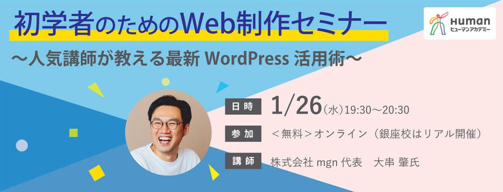 初学者のためのWeb制作セミナー~人気講師が教える最新WordPress活用術~ | 現在使用されているCMS(コンテンツマネジメントシステム)の中でNo.1のシェアを誇るWordPress(ワードプレス)。 世界中のWebサイトの内の38%以上がWordPressで作られていると言われています。※W3Techs 調べ 今回は、株式会社mgnの代表であり、 ヒューマンアカデミーのWordPress講座の監修もご担当いただいている 大串 肇氏をお招きして、WordPressの最新機能の紹介や、その使い方について詳しく丁寧に解説頂きます! |
