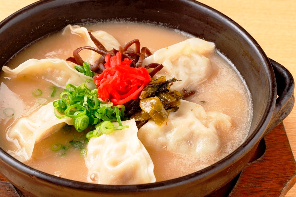 白濁した濃厚スープに、ネギ、紅しょうが、高菜、キクラゲがあしらわれた博多屋台名物からのインスパイア餃子。〆餃子はぜひこちらで…。