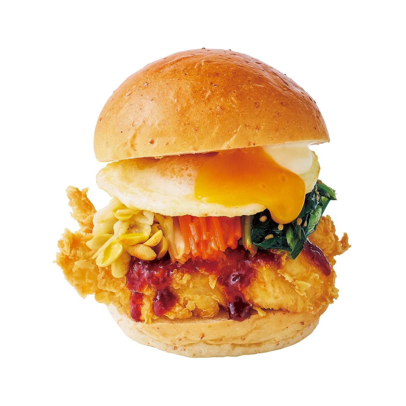 日本で定番となった月見バーガーに韓国風のイメージをプラスした新感覚の月見バーガーです。国産ササミを使用したチキンフィンガーに、コチュジャンベースの特製ソースをかけ、もやし、にんじん、小松菜の3種類のナムルをトッピング。とろ~り黄身の目玉焼き風オムレツと一緒にバンズで挟み込むことで、韓国ビビンバをバーガーにアレンジした、「オリーブチキンカフェ」オリジナルのまったく新しい月見バーガーができました。野菜もたっぷりとれる「月見ビビンバーガー」は一度食べるとやみつきになる美味しさです!