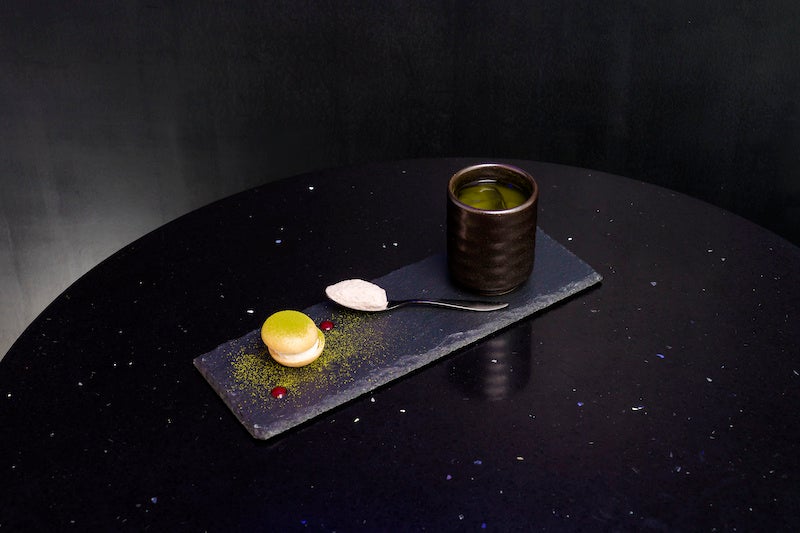 抹茶パウダーで天の川を、季節の和菓子と餡子とウイスキーのエスプーマで惑星を表現。